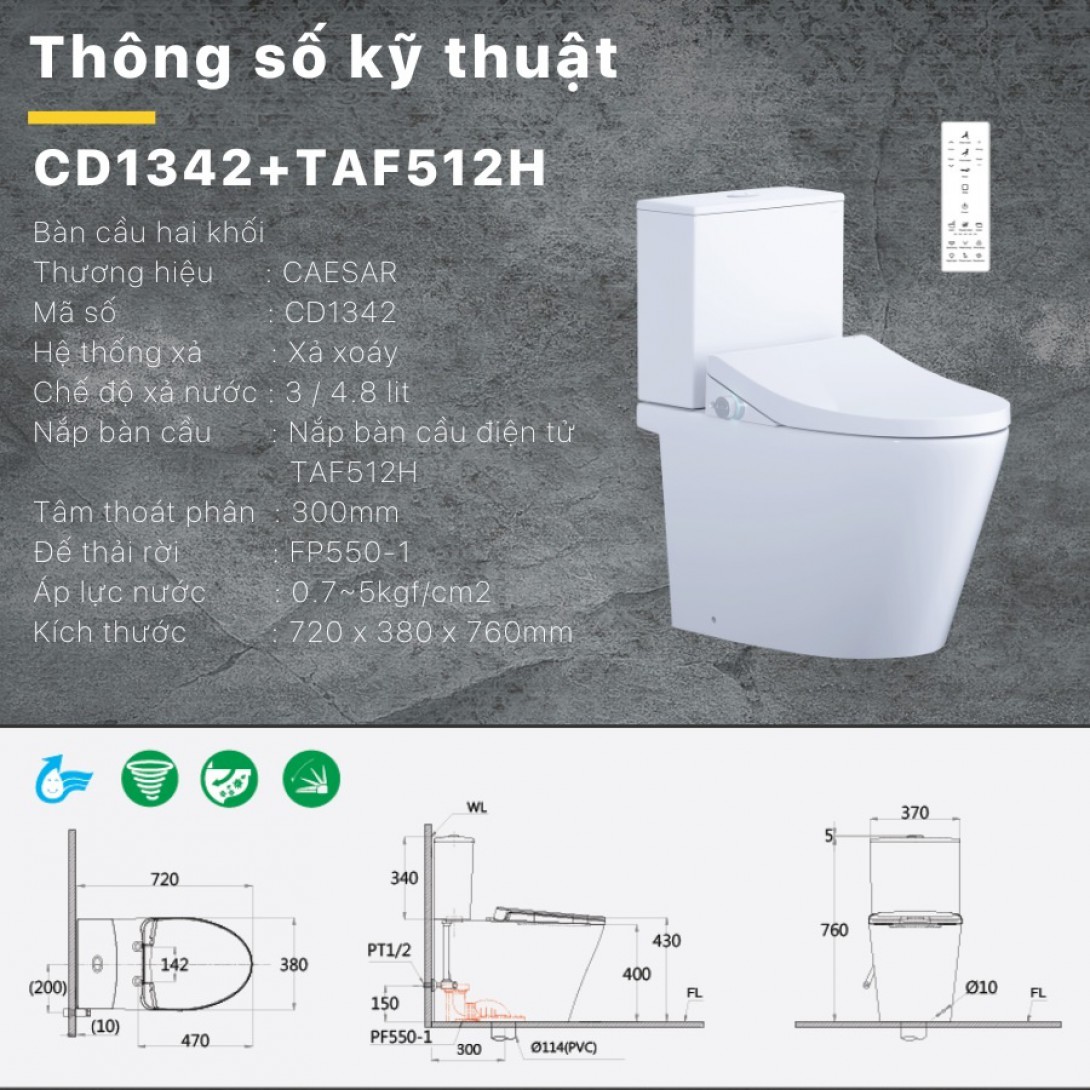 Thông số bồn cầu điện tử CAESAR CD1342/TAF512H