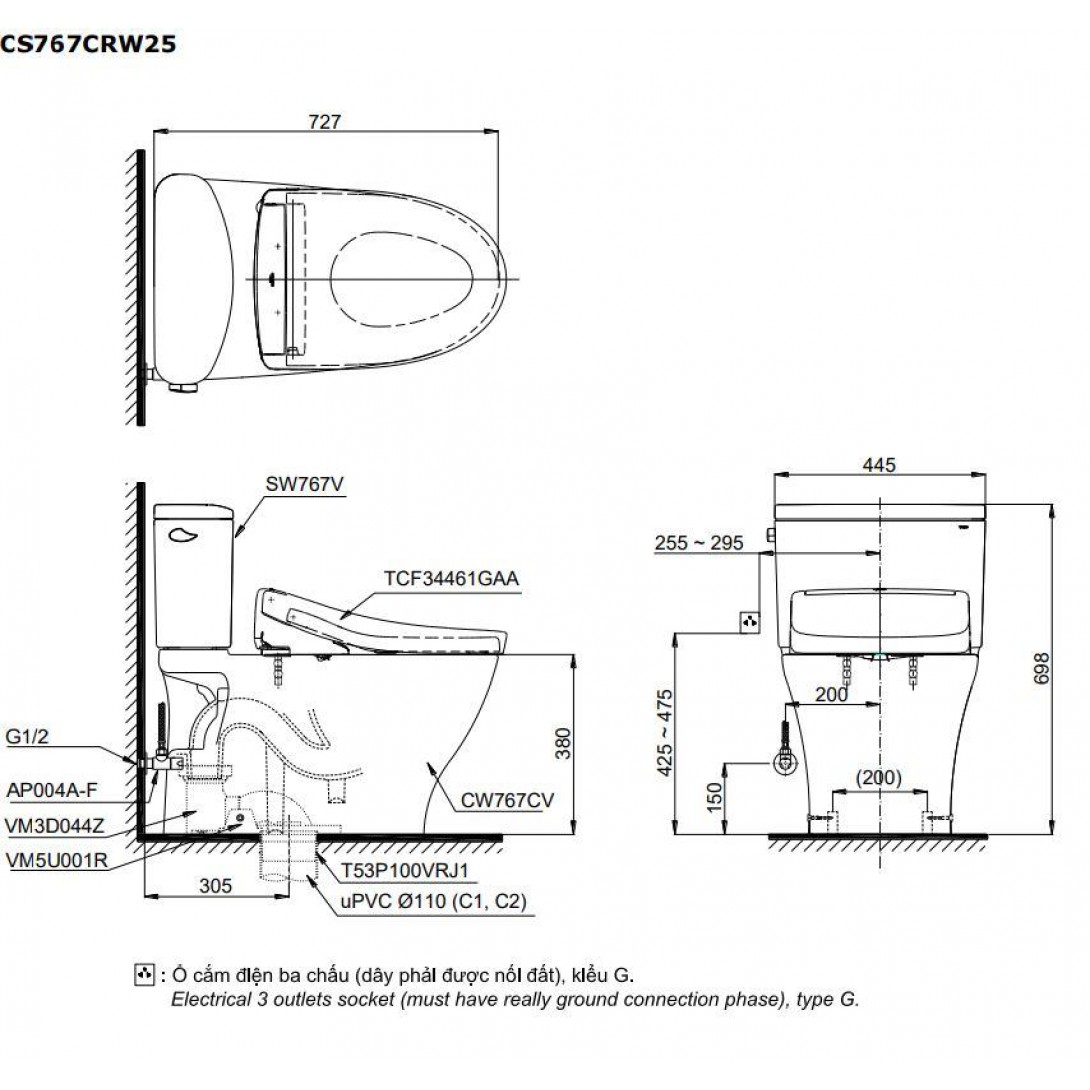 Bản vẽ kích thước bồn cầu Washlet Toto CS767RW25