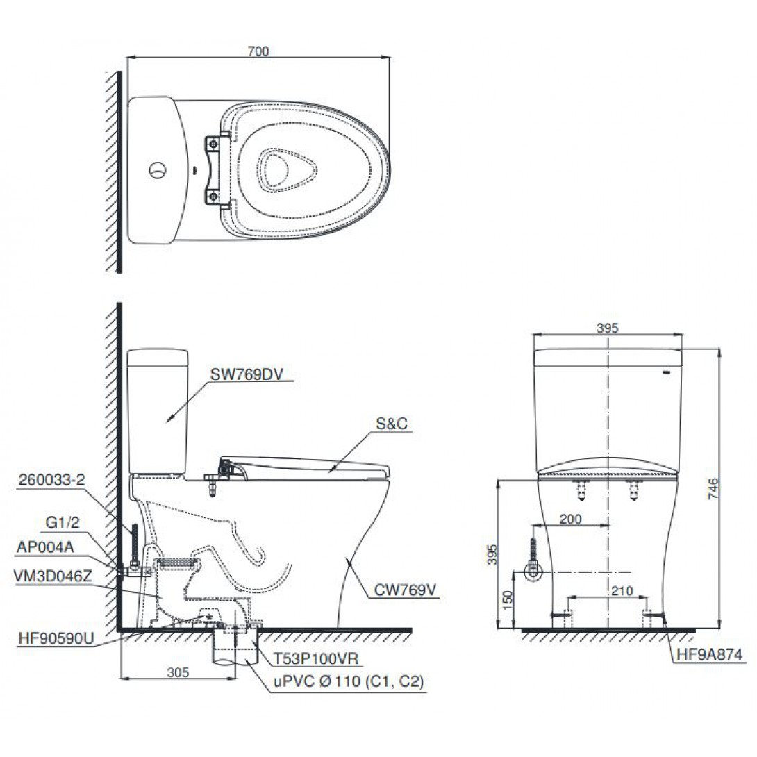 Bản vẽ kích thước xí bệt nắp điện tử TOTO CS769W11