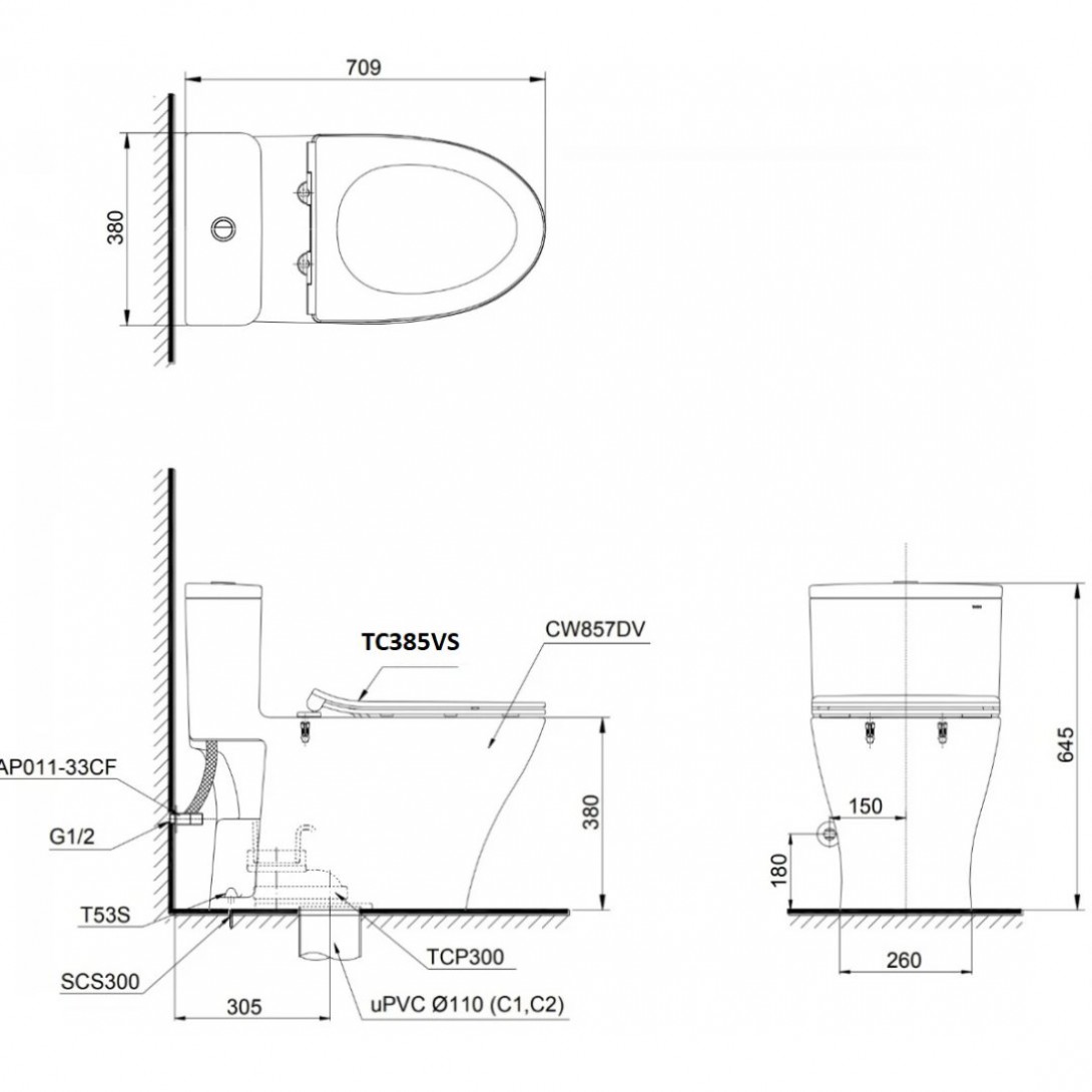 Bản vẽ kích thước xí bệt C857D TOTO nắp êm TC385VS
