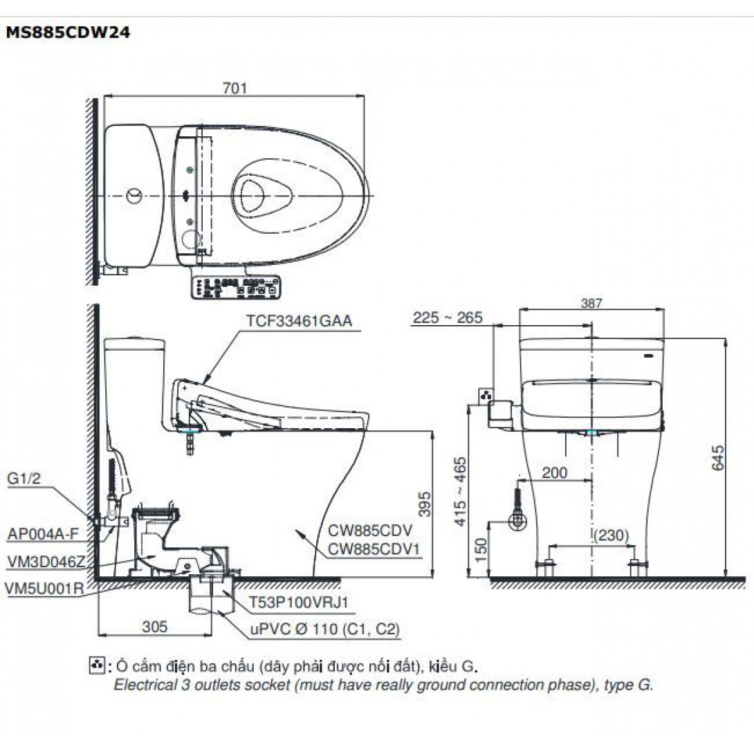 Thông tin bồn cầu TOTO MS885CDW25 nắp rửa điện tử