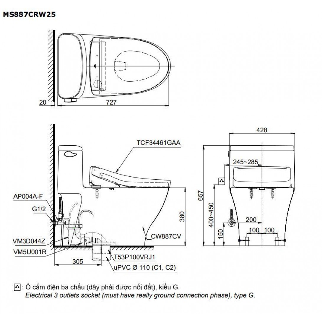 Thông số bồn cầu nắp điện tử TOTO MS887CRW25