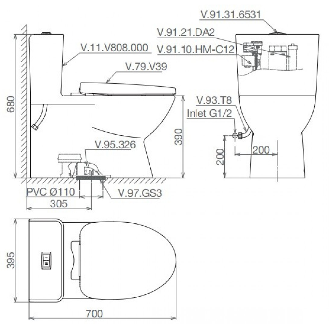 Bản vẽ kích thước bồn cầu V808 Nano Titan Viglacera