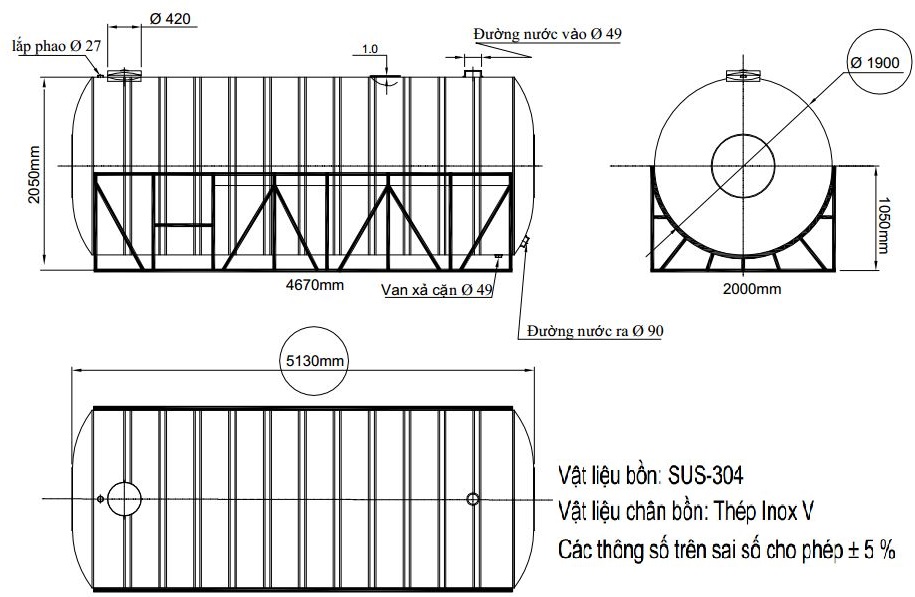 Thông số bồn nước Inox Toàn Mỹ 500L ngang SUS 304 Chất liệu: Inox Sus 304 ngoại n..
