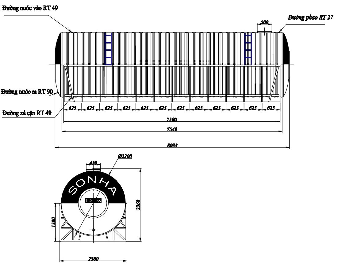 Bản vẽ téc nước inox 30000 lít ngang SUS 304 Sơn Hà phi 2200