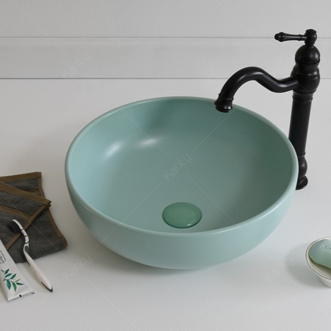Reviews Over Chậu Lavabo Kanly SU516 Đặt Bàn Sứ Tròn Màu Xanh Ngọc 400x140 mm