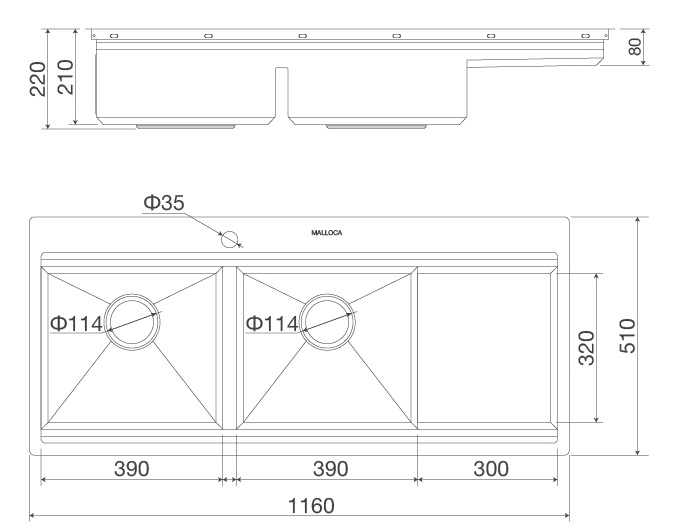 Bản vẽ kích thước chậu inox 304 Malloca MS 1162R