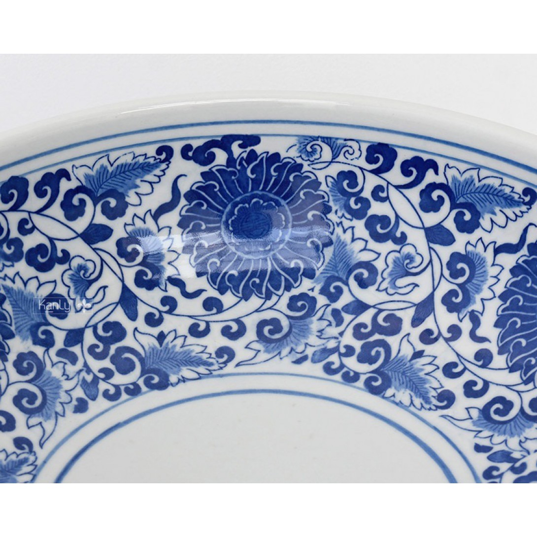 Trên nền sứ trắng ngà, sắc xanh cobalt tạo nên độ tương phản điềm tĩnh đặc trưng của Blue and White Porcelain, trong khi đường viền kép khép lại tổng thể bằng một nhịp trật tự, cân bằng và tiết chế.