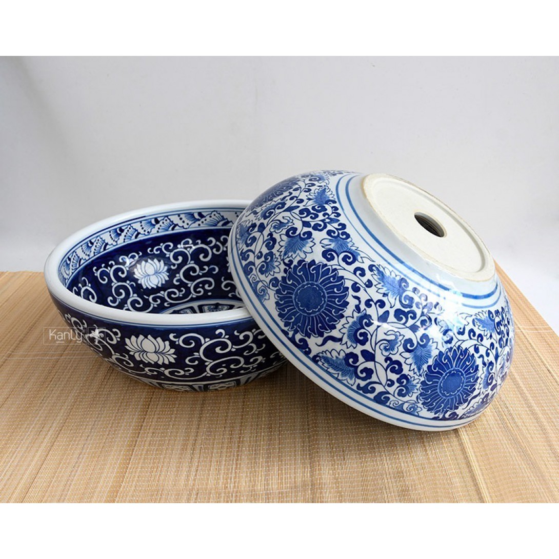 Chậu sứ SU121 với sắc lam cobalt vẽ tay trên nền sứ trắng, tạo nên một lớp họa tiết mang chiều sâu thị giác.