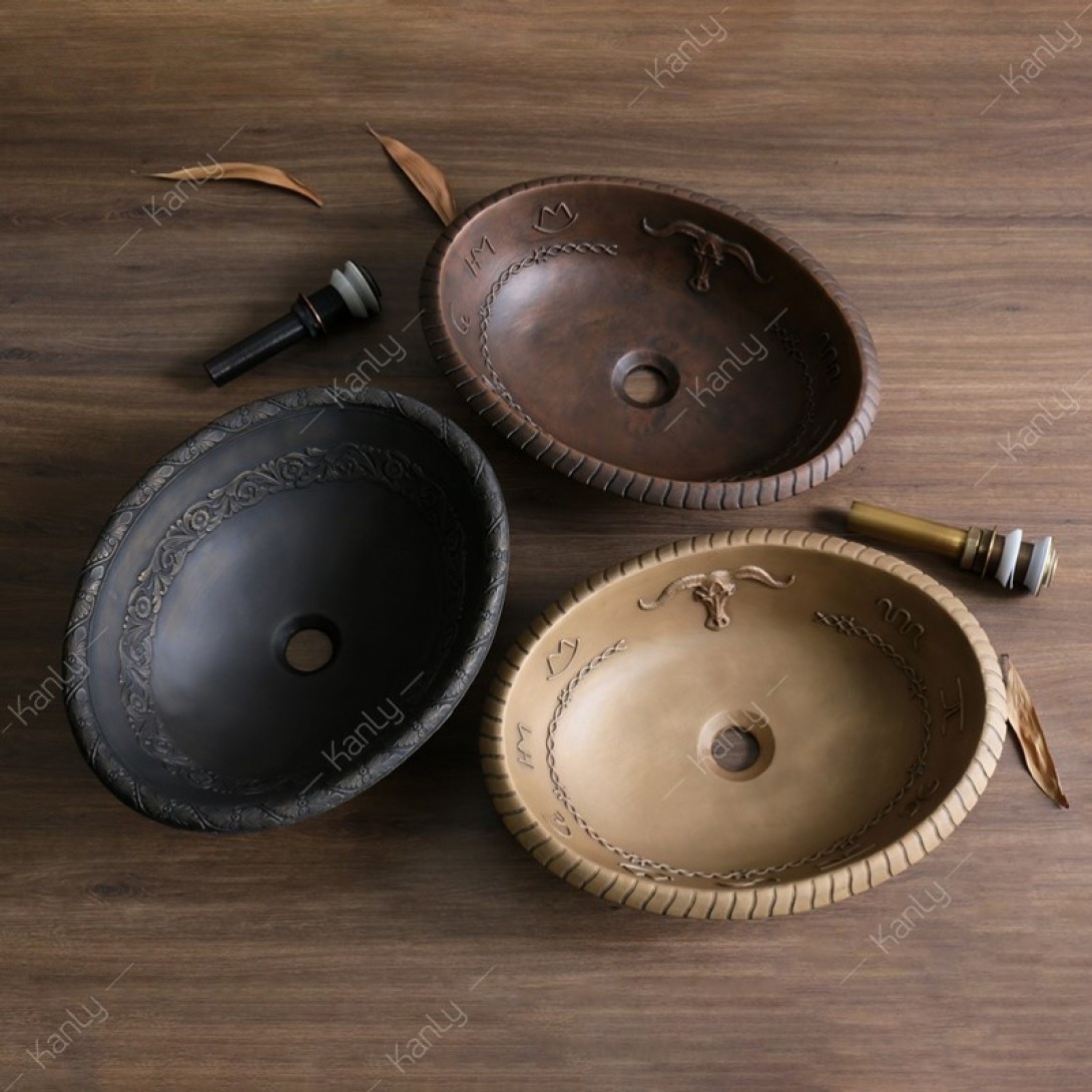 Reviews Over Chậu Lavabo Kanly BS026 Đặt Bàn Đồng Thau Họa Tiết Đầu Trâu 490x380x130 mm