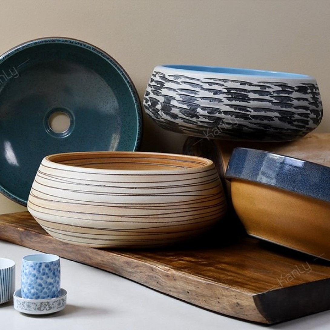 - Chậu rửa Kanly bằng gốm sứ sản xuất thủ công, chậu sứ mỹ thuật, có thể dùng như lavabo sứ để nổi trên mặt bàn.