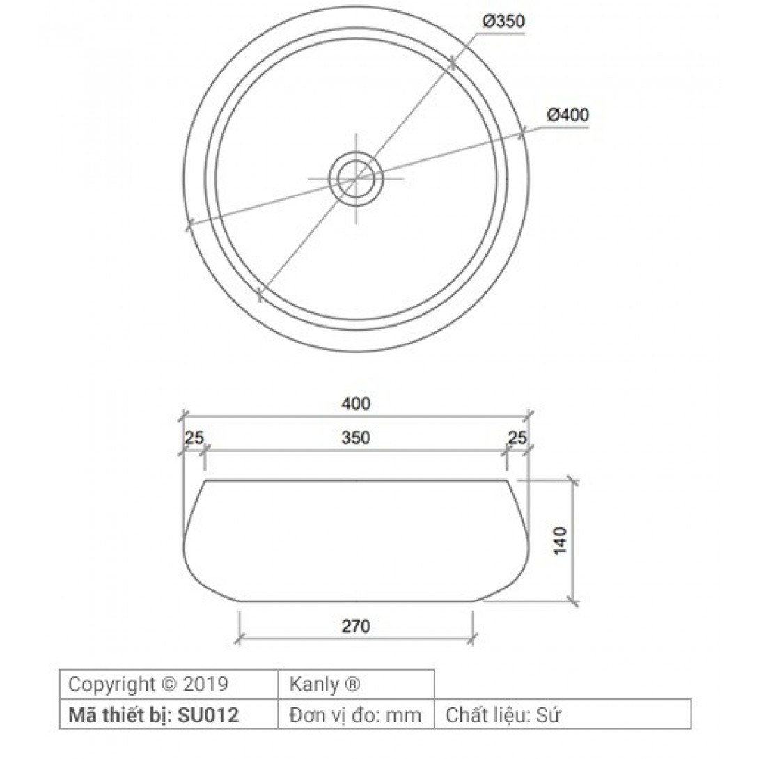 Bản vẽ kích thước chậu rửa mặt Kanly SU012 sứ in mỹ thuật