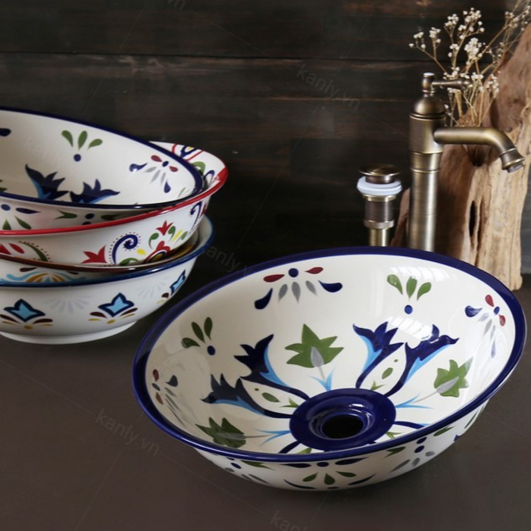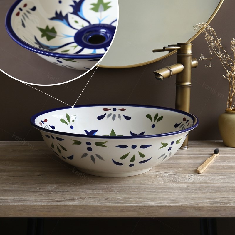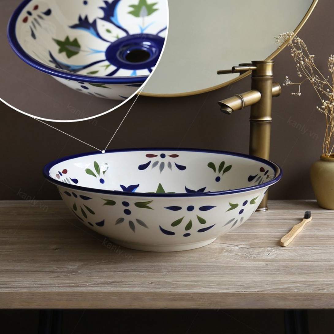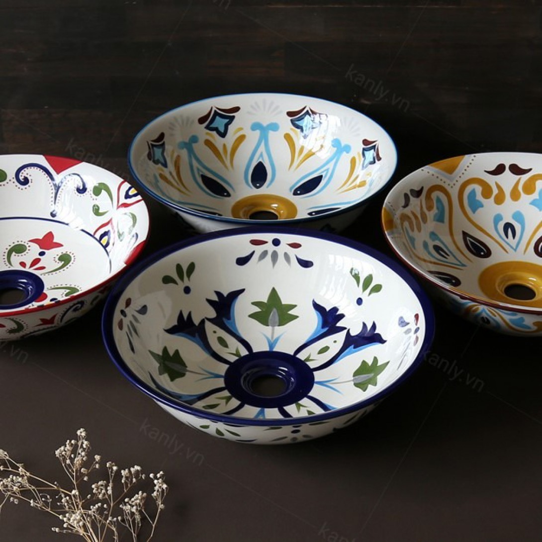 - Chậu rửa Kanly bằng gốm sứ sản xuất thủ công, chậu sứ mỹ thuật, có thể dùng như lavabo sứ để nổi trên mặt bàn.