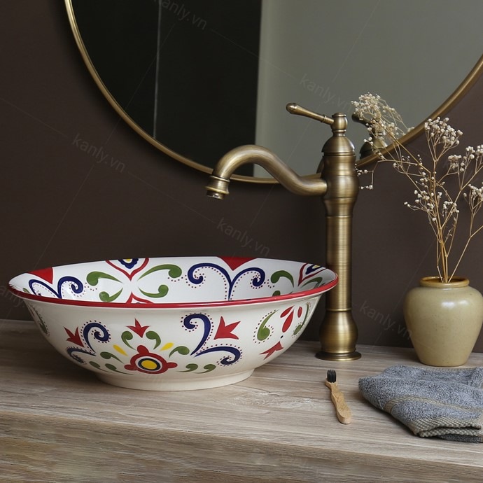 - Lắp đặt: Đặt trên mặt bàn gỗ, khung chân đế sắt hoặc giá đỡ sắt rèn mỹ thuật. Phù hợp khi sử dụng cùng các thiết bị: Vòi nước, bộ xả, phụ kiện phòng tắm,… bằng đồng giả cổ