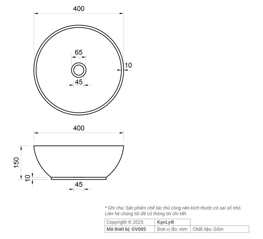 Thông tin chậu lavabo Kanly GV005 bằng gốm đặt bàn