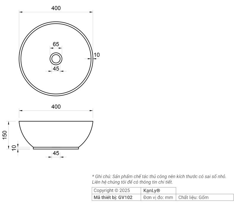 Bản vẽ kích thước chậu Kanly GV102