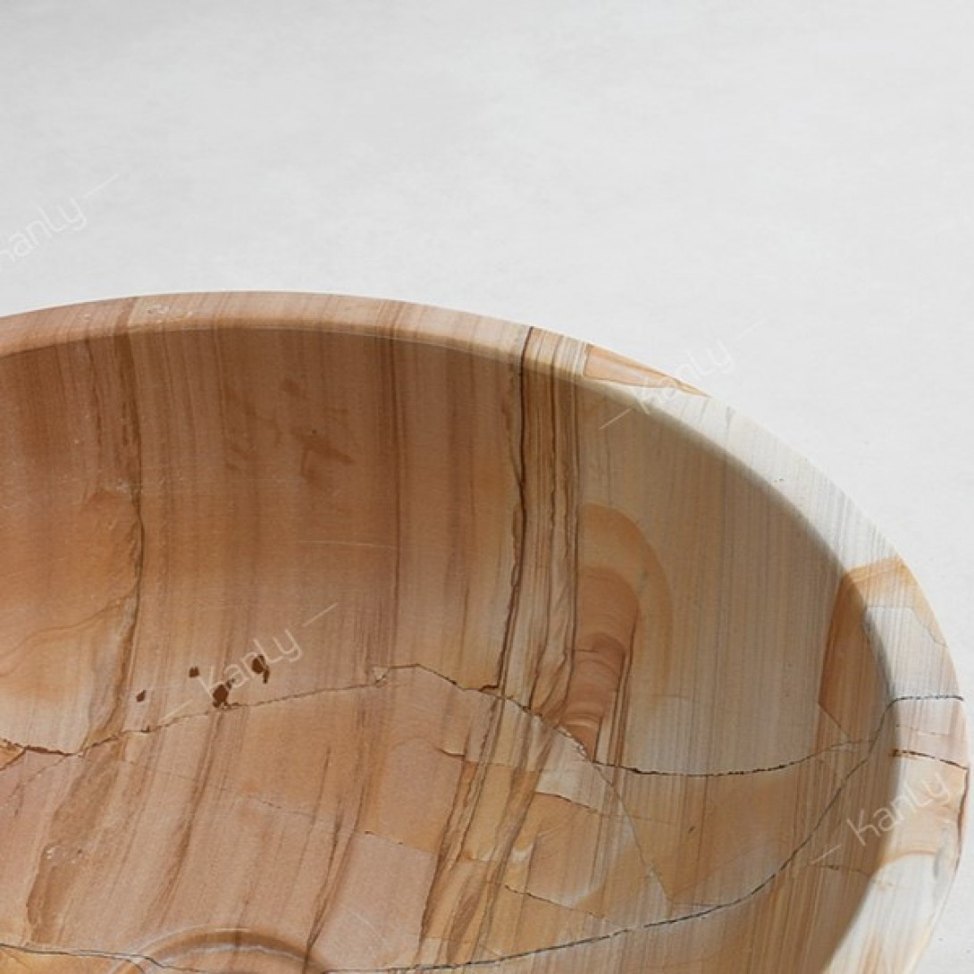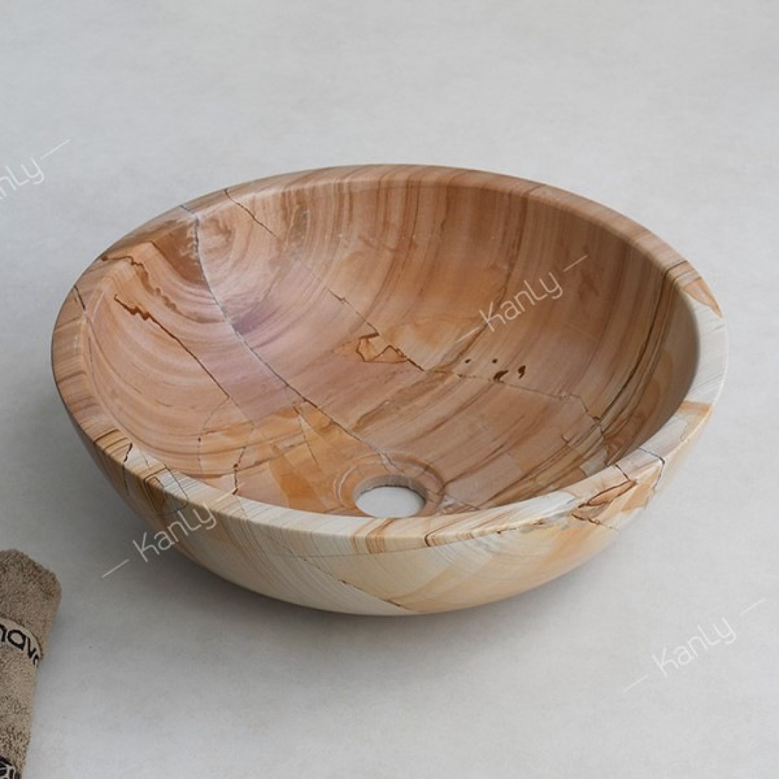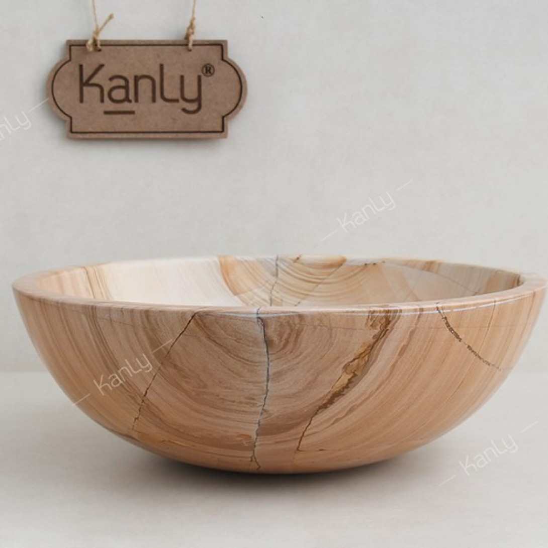 - Đá tự nhiên này có tông màu vàng nâu kết hợp với đường vân nổi nhấp nhô, chạy dài trông như những thớ gỗ nằm trên bề mặt đá vậy, độc đáo và không trùng lặp, không gây nhàm chán như những chiếc chậu rửa được sản xuất công nghiệp hàng loạt.