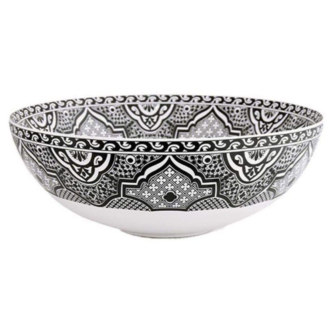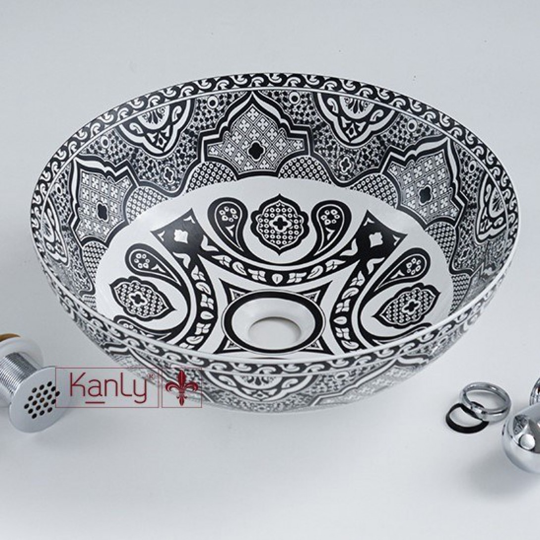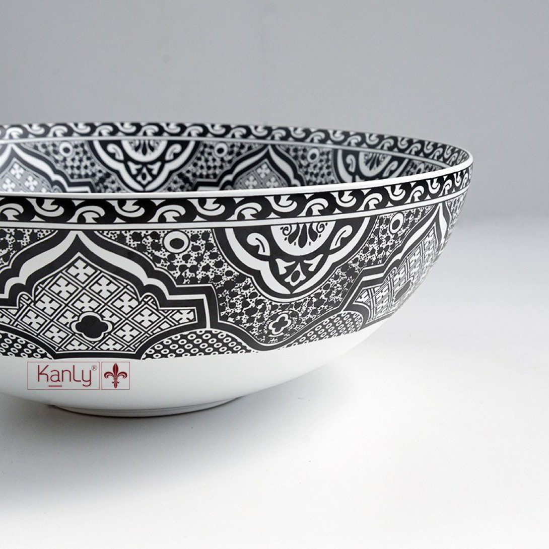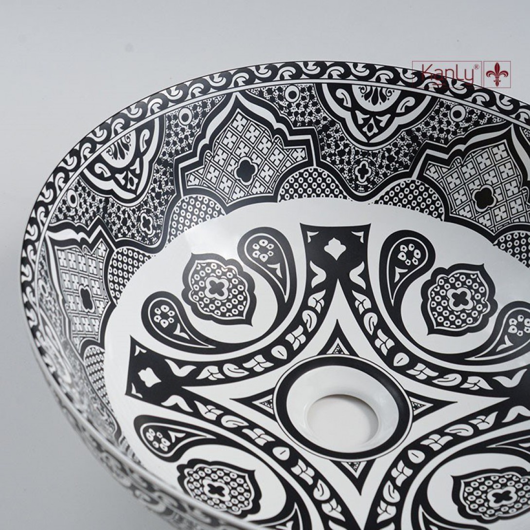 - Lavabo sứ mỹ thuật phong cách Moroccan SU713 gợi nhắc đến vẻ đẹp di sản của vùng Bắc Phi, nơi nghệ thuật hình học và hoa văn bản địa được truyền từ thế hệ này sang thế hệ khác. Mặt trong và ngoài chậu được phủ kín bởi những họa tiết đối xứng, hòa quyện giữa các tông màu như nâu gạch, xanh lá bạc hà, vàng hoàng thổ và đen huyền.