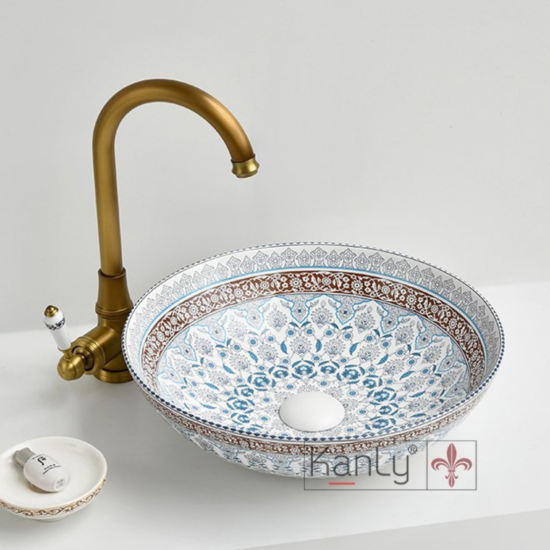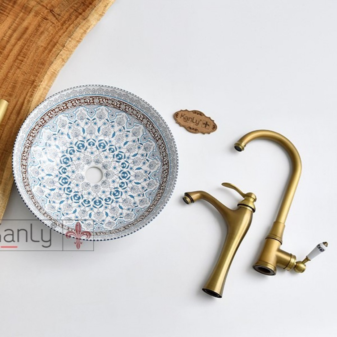 - Lắp đặt: Đặt trên mặt bàn gỗ, khung chân đế sắt hoặc giá đỡ sắt rèn mỹ thuật. Phù hợp khi sử dụng cùng các thiết bị: Vòi nước, bộ xả, phụ kiện phòng tắm,… bằng đồng giả cổ