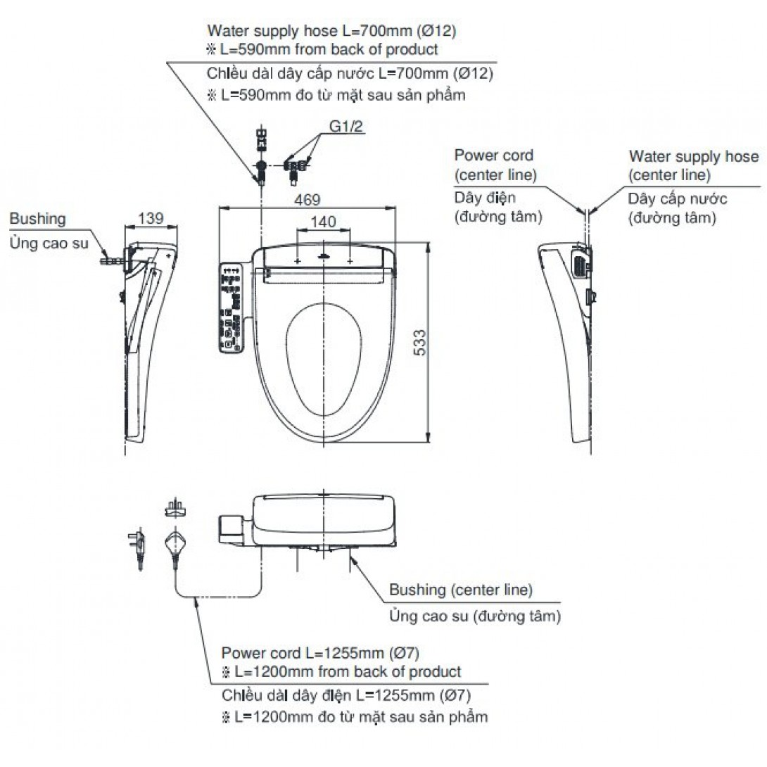 Thông số kỹ thuật nắp bồn cầu điện tử TOTO TCF24460AAA Nắp rửa điện tử Washlet (220V) củ..