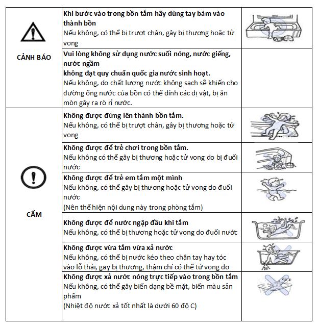 - Tuyệt đối không đứng lên thành bồn tắm. Nếu không, sẽ có thể bị trượt ngã làm hỏng sản phẩm.