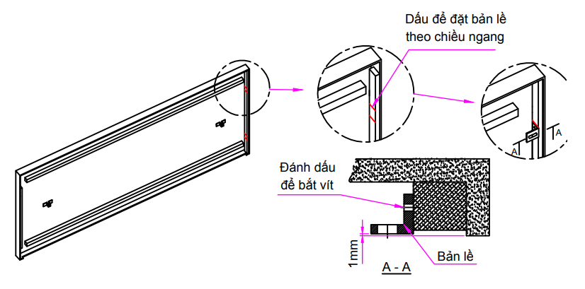 Lắp ráp bản lề trên yếm dài: Đặt bản lề vào vị trí đã đánh dấu theo chiều ngang có sẵn trên yếm, chiều dọc lấy cách mặt ngoài 1mm. Sau đó lấy dấu bắt vít rồi dùng khoan bắt vít, cố định bản lề vào yếm dài.