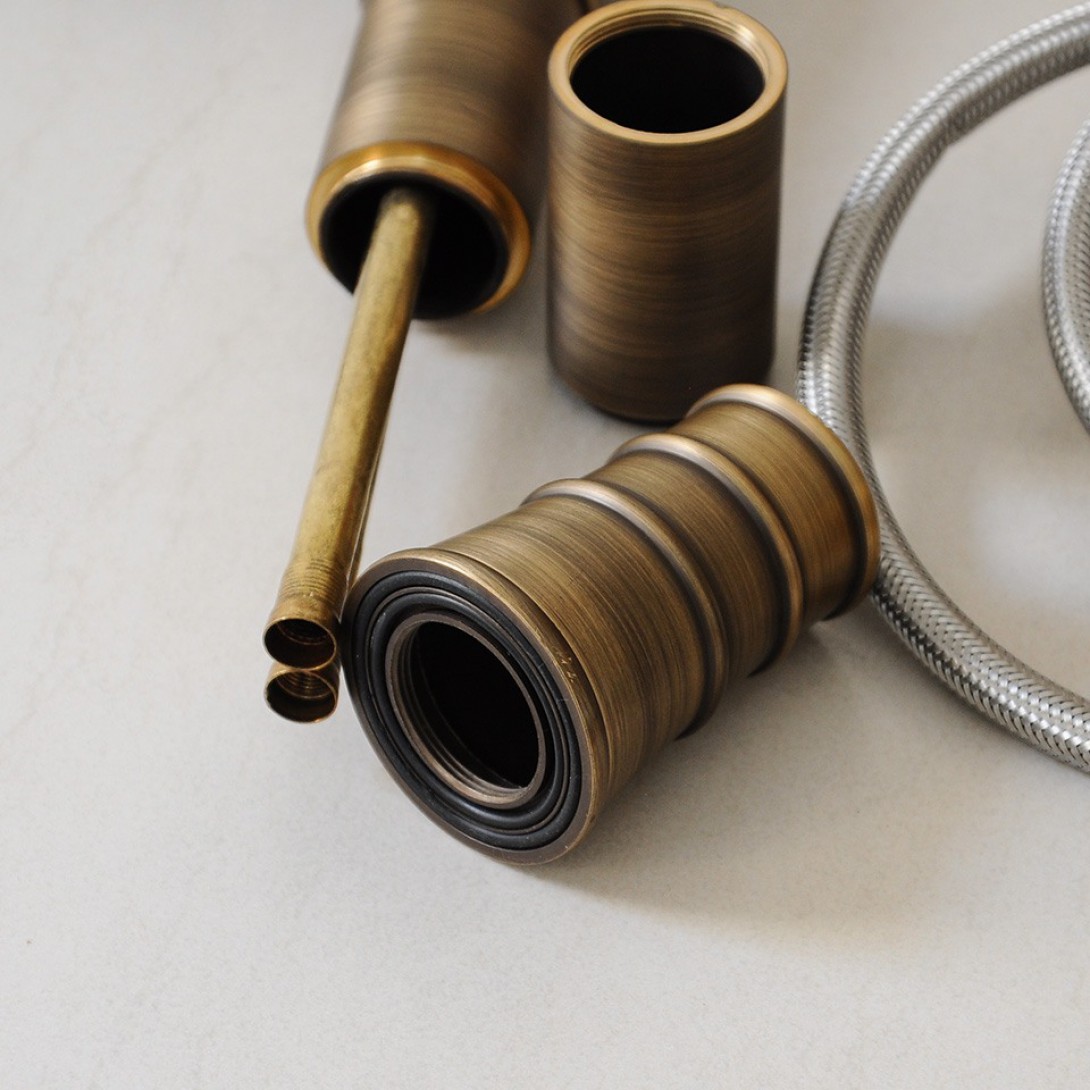 - Thiết bị bằng đồng thau, tông màu đồng cổ, phù hợp không gian kiến trúc mộc mạc, cổ kính, nâu ấm, cổ điển.