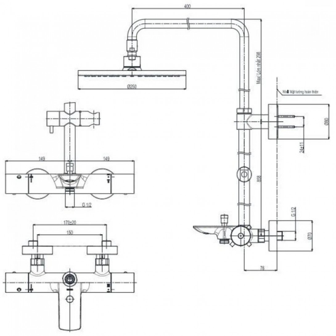 Bản vẽ kích thước sen cây liền khối TOTO TBW 07403A MBL 250mm