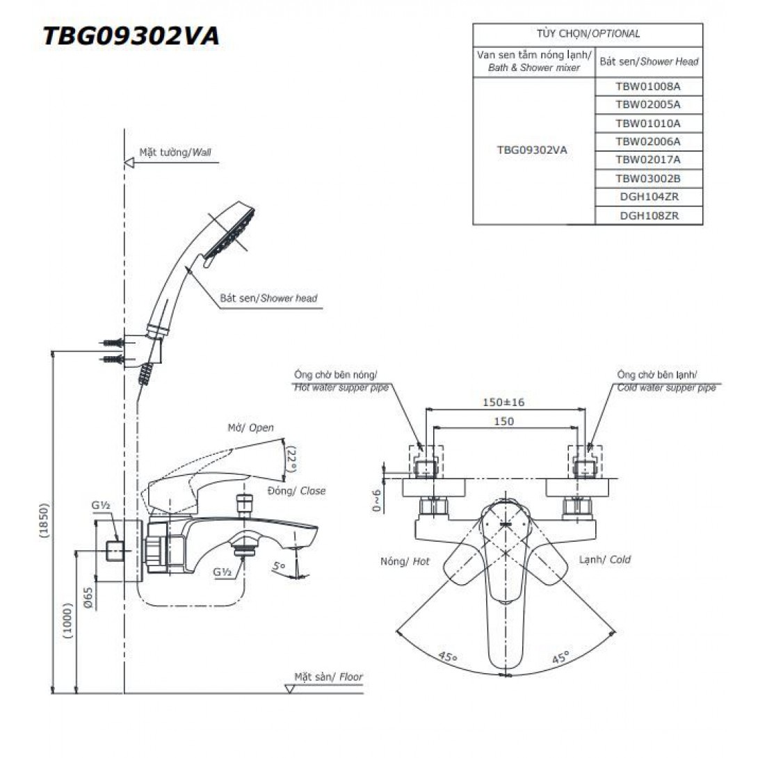 Bản vẽ kích thước vòi sen TBG09302VA/TBW07012A